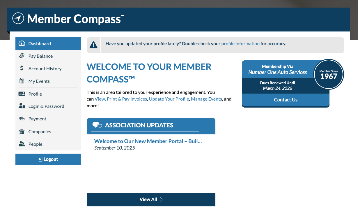 Once logged into the website, you will be redirected to your Member Compass. Along with information about your current membership status, you’ll also see several tabs to the left including your profile and account history. You may also see dynamic information boxes that show the current number of upcoming events you’re registered for, or a box displaying how many outstanding invoices you have. Note: if you are not registered for any upcoming events or do not have outstanding invoices, that corresponding information will not display.